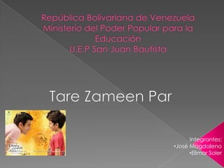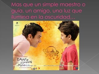 El documento trata sobre la historia de Ishaan, un niño de 8 años con dislexia que es internado por sus padres. A través de la intervención de un nuevo profesor, Ishaan redescubre la felicidad y el valor de sus sueños. La película transmite valores como la fe y la importancia de creer en uno mismo para superar obstáculos.