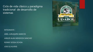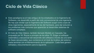 El documento describe el ciclo de vida clásico y los paradigmas tradicionales de desarrollo de sistemas. Explica que el ciclo de vida clásico, también conocido como modelo en cascada, sigue un enfoque secuencial a través de fases como el análisis del sistema, el diseño conceptual, el diseño lógico y la codificación. También menciona otros paradigmas como el modelo espiral y el modelo de prototipo.