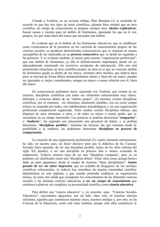 1) El autor discute el desarrollo de la didáctica de las ciencias sociales como disciplina científica. 2) Argumenta que se ha movido de ser una "disciplina posible" a una "en proceso de maduración" a través de la creación de una organización profesional y el establecimiento de elementos estructurantes propios. 3) Sostiene que las ciencias de la educación, no las ciencias sociales de referencia, son los verdaderos anclajes estructurantes para esta disciplina científica emergente.