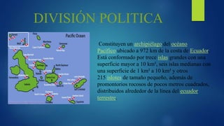 Las Islas Galápagos son un archipiélago ecuatoriano declarado Patrimonio de la Humanidad. Está conformado por 13 islas grandes, 6 medianas y más de 200 islotes, distribuidos alrededor de la línea ecuatorial. Las islas albergan numerosas especies endémicas de reptiles, mamíferos y aves. Fueron estudiadas por Charles Darwin durante su expedición en el Beagle, lo que contribuyó al desarrollo de su teoría de la evolución. Actualmente, la principal actividad económica es el