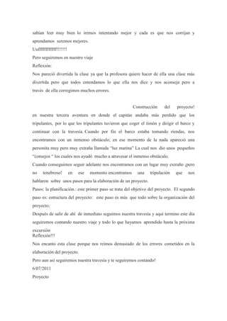El documento narra las aventuras de un grupo de tripulantes y su capitán que viajan en barco explorando diferentes islas en busca de nuevos conocimientos. En cada isla encuentran nuevos desafíos y aprendizajes guiados por su profesora, como actividades sobre literatura, proyectos, exposiciones y juegos de palabras. A pesar de algunos inconvenientes, van mejorando su trabajo en equipo y aprendiendo lecciones con cada experiencia.