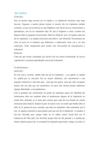 El documento narra las aventuras de un grupo de tripulantes y su capitán que viajan en barco explorando diferentes islas en busca de nuevos conocimientos. En cada isla encuentran nuevos desafíos y aprendizajes guiados por su profesora, como actividades sobre literatura, proyectos, exposiciones y juegos de palabras. A pesar de algunos inconvenientes, van mejorando su trabajo en equipo y aprendiendo lecciones con cada experiencia.
