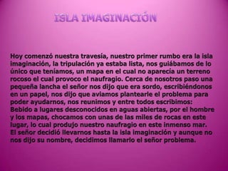 El documento narra las aventuras de una tripulación que sufre un naufragio en su viaje a la Isla Imaginación. Un hombre llamado el Señor Problema los ayuda y los lleva a dicha isla. Luego reparan su barco y visitan otros islotes, donde conocen gente y compran suministros. Finalmente visitan el Parque Acuático de los Objetivos, donde ven animales marinos y disfrutan de actividades acuáticas antes de regresar a su vida cotidiana.