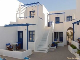 Este documento presenta una introducción a la Isla de Santorini en Grecia a través de varias fotografías e información clave. En pocas oraciones, resume que Santorini es un archipiélago volcánico en el Mar Egeo con alrededor de 14,000 habitantes, conocido por sus paisajes de acantilados, lagunas y puertos colgantes que lo han convertido en un importante destino turístico.