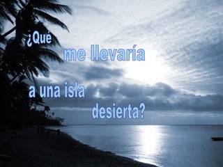 La persona llevaría a su gato Lara, su ordenador que usa diariamente, y libros a la isla desierta. También desearía llevar papel, lápiz y una botella para escribir mensajes en la esperanza de ser rescatado.