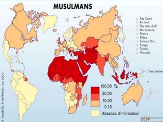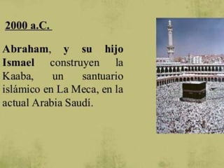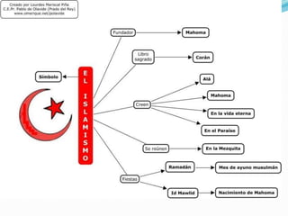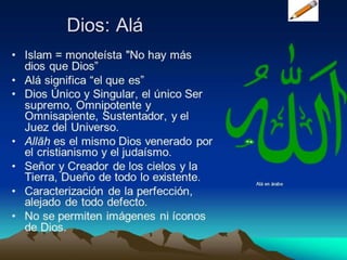 Este documento describe los orígenes y creencias fundamentales del Islam. Explica que Mahoma fundó esta religión en La Meca en el año 622 d.C. después de recibir revelaciones del ángel Gabriel. Estas revelaciones fueron compiladas en el Corán, el libro sagrado del Islam. El documento también resume los Cinco Pilares del Islam que guían la vida de los musulmanes.