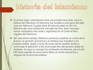 El documento resume la historia del Islam, incluyendo que Mahoma fundó la religión en el siglo VII d.C. después de recibir revelaciones de Alá, y los seis artículos de fe centrales del Islam como la creencia en un único Dios y en Mahoma como su profeta. También describe las Cinco Columnas del Islam, como la oración, la limosna, el ayuno durante Ramadán y el peregrinaje a La Meca.