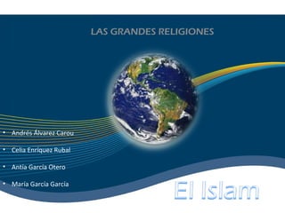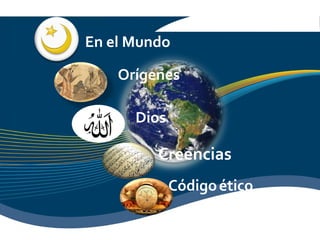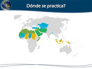 Este documento resume las principales características del Islam. Se originó en Arabia en el siglo VII d.C. con la predicación del profeta Mahoma. Los musulmanes creen en un único dios llamado Alá y siguen las enseñanzas reveladas a Mahoma en el Corán. Practican ritos como la oración cinco veces al día y el ayuno durante el mes sagrado del Ramadán.