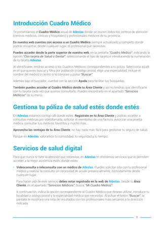 Este documento proporciona un cuadro médico para la provincia de Baleares que incluye información sobre médicos de familia, pediatras y otros especialistas, así como centros médicos. Se proporcionan los nombres, direcciones, teléfonos y horarios de más de 100 profesionales e instalaciones médicas de la zona. También se incluye información sobre servicios digitales de salud como videoconsultas, chat médico y recetas electrónicas.