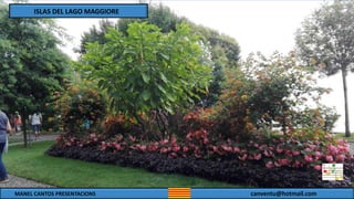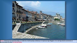 El documento describe las islas del lago Maggiore en Italia, en particular las islas Borromeas. Describe las características de las islas Madre, Bella e Isola dei Pescatori, incluyendo sus palacios, jardines y atractivos turísticos. La familia Borromeo ha sido propietaria de las islas durante siglos y ha construido impresionantes palacios y jardines botánicos en las islas Madre e Bella.