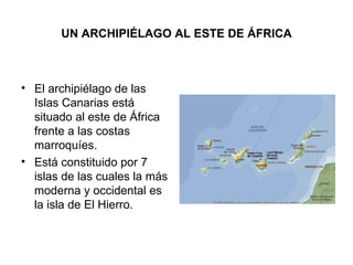 El documento describe brevemente las Islas Canarias, ubicadas frente a las costas de Marruecos en el este de África. Está constituido por 7 islas, siendo la más occidental y pequeña la isla de El Hierro. Recientemente, se registraron terremotos de baja intensidad en El Hierro, anticipando una erupción volcánica submarina que se produjo bajo el mar, matando peces y formando una mancha flotante de lava.