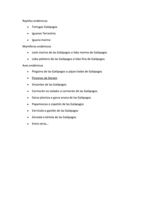 Las islas Galápagos son un archipiélago ecuatoriano en el océano Pacífico conocido por su gran biodiversidad y por haber inspirado la teoría de la evolución de Darwin. Está conformado por trece grandes islas, seis medianas y numerosos islotes, y alberga muchas especies únicas de reptiles, mamíferos y aves. Las islas fueron declaradas Patrimonio de la Humanidad en 1978 debido a su importancia ecológica.