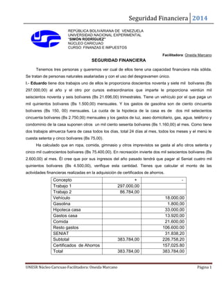 El documento presenta tres casos de personas y calcula su situación financiera y capacidad de ahorro. En el primer caso, Eduardo tiene dos trabajos y varios gastos fijos mensuales. En el segundo caso, Lucía trabaja y da clases particulares, paga una hipoteca y tiene gastos varios. En el tercer caso, Susana y Carlos son una pareja casada con ingresos combinados, gastos del hogar y estilo de vida. Se calcula el enriquecimiento neto de cada caso y si podrían afrontar nuevos gastos planificados.