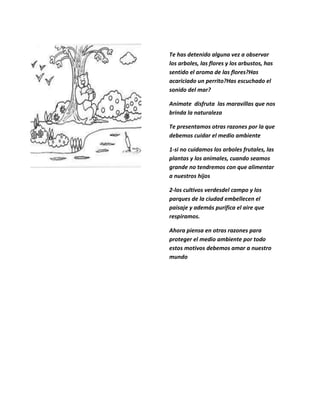 El documento habla sobre la importancia de proteger el medio ambiente. Explica que el medio ambiente incluye todo lo que nos rodea como plantas, animales, agua, aire y personas. También menciona algunas razones para cuidarlo como asegurar la disponibilidad de alimentos y purificar el aire. Finalmente, da sugerencias sobre cómo contribuir individualmente al cuidado del medio ambiente.