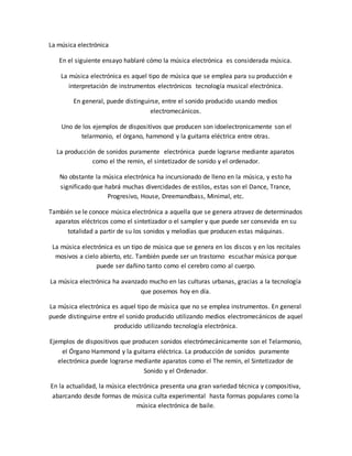 La música electrónica se produce usando instrumentos electrónicos y tecnología como sintetizadores y ordenadores en lugar de instrumentos tradicionales. Algunos ejemplos de dispositivos electrónicos musicales son el telarmonio, el órgano Hammond y la guitarra eléctrica. La música electrónica abarca desde música experimental hasta géneros populares como la música de baile y ha evolucionado mucho gracias a los avances tecnológicos.