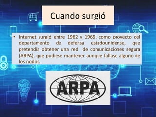 Internet surgió entre 1962 y 1969 como un proyecto del departamento de defensa estadounidense para crear una red de comunicaciones segura. En 1969 se estableció la primera conexión de la red ARPANET entre dos laboratorios. En los años siguientes, se introdujo el correo electrónico y protocolos como TCP/IP, ampliando el uso de la red más allá del ámbito militar. En 1990, Tim Berners-Lee desarrolló HTML y HTTP, dando origen a la World Wide Web.