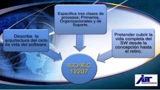 La norma ISO 12207 establece procesos y actividades para el ciclo de vida del desarrollo de software, incluyendo procesos primarios como adquisición, suministro, desarrollo, operación y mantenimiento, así como procesos de soporte como documentación, control de configuración y aseguramiento de calidad. El objetivo principal es proporcionar una estructura común para que todas las partes involucradas en el desarrollo de software utilicen un lenguaje común.