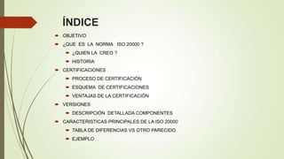 La norma ISO 20000 se concentra en problemas de tecnologías de información mediante el uso de un planteamiento de sistema de asistencia. Su cumplimiento permite asegurar y demostrar el cumplimiento de la función de TI en la entrega de servicios de acuerdo con las mejores prácticas internacionales, a la vez que contribuye a la gestión efectiva entre el servicio provisto y terceras partes.