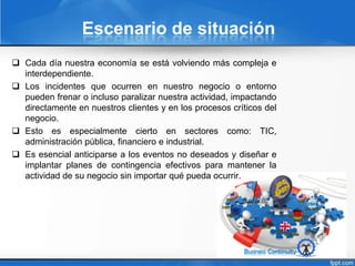 Este documento describe los principales aspectos de un sistema de gestión de continuidad del negocio (BCMS) de acuerdo con la norma ISO 22301. Explica que un BCMS permite a las organizaciones anticiparse a eventos no deseados y mantener las operaciones del negocio ante cualquier interrupción. Detalla los pasos del ciclo de vida de un BCMS, incluyendo la comprensión de la organización, el desarrollo e implementación de planes de respuesta, y las pruebas y revisiones continuas. También resalta los beneficios de ISO 22301 como la