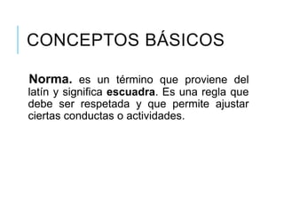 El documento describe los conceptos básicos de la gestión de calidad e ISO 9000. Explica que las normas son reglas que deben respetarse para ajustar actividades, y los estándares son especificaciones técnicas acordadas para asegurar que productos, procesos y servicios cumplan su propósito. También resume los principios de la gestión de calidad como el enfoque al cliente, liderazgo, participación del personal, y mejora continua.