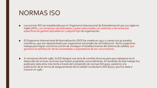 El documento describe las normas ISO y la organización ISO. ISO (Organización Internacional de Normalización) establece normas internacionales para sistemas de gestión de calidad a través de comités técnicos. La norma ISO 9000 especifica los requisitos para sistemas de gestión de calidad y define la terminología relacionada con la calidad. El objetivo es ayudar a las organizaciones a mejorar la satisfacción de los clientes mediante la mejora continua de los procesos y el cumplimiento de los requisitos.