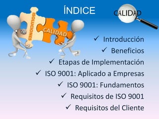 El documento aborda la norma ISO 9001, enfocándose en los requisitos para establecer un sistema de gestión de calidad en organizaciones de diversos sectores. Se detallan los beneficios de adoptar esta norma, sus etapas de implementación y la importancia de entender las necesidades del cliente para garantizar la calidad en productos y servicios. Además, se enumeran requisitos clave como la documentación, gestión de recursos y mejora continua necesarios para cumplir con la norma.