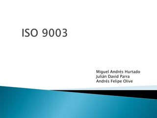 ISO 9003 proporciona un sistema de aseguramiento de calidad para las empresas que deseen establecer controles y pruebas de calidad para la producción final. Se enfoca específicamente en la inspección del producto terminado, a diferencia de ISO 9001 e ISO 9002 que cubren todo el proceso de producción. Para cumplir con ISO 9003, una empresa debe documentar su sistema de calidad a través de un manual y procedimientos que definan y mantengan la organización y operación del sistema de manera relevante para su negocio.