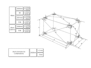 La norma ISO establece dimensiones mínimas y máximas para contenedores con tolerancias positivas y negativas. IICL permite tolerancias adicionales de hasta 5 mm para componentes de marcos y 10 mm para otros componentes. El documento proporciona las dimensiones aceptadas por ISO e IICL para varios componentes de contenedores como rieles, paneles, cabezales, sills y túneles de enganche. Cualquier dimensión fuera de los límites IICL requiere reparación.