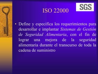 El documento describe el estándar ISO 22000 para sistemas de gestión de seguridad alimentaria. ISO 22000 define los requisitos para desarrollar e implementar sistemas de gestión de seguridad alimentaria para mejorar la seguridad de los alimentos a lo largo de la cadena de suministro. Incorpora los elementos de buenas prácticas de fabricación, análisis de peligros y puntos de control crítico, y especifica los requisitos de documentación, responsabilidad de la dirección, y planificación y realización de productos seguros