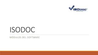 El documento describe los diferentes módulos del software ISODOC, incluyendo módulos para control documental, mejora continua, proveedores, servicio al cliente, calibración de equipos, indicadores de gestión, talento humano y administración. Cada módulo permite gestionar un proceso o área funcional específica dentro de la organización.
