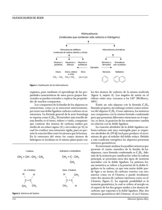 Este documento describe un modelo didáctico llamado "Huesito" que se utiliza para enseñar conceptos de estructura e isomería de monómeros vinílicos a estudiantes de nivel secundario. El modelo se construye con tarjetas de cartulina que muestran diferentes estructuras de alquenos derivados del etileno. Al doblar las celdas de las tarjetas, los estudiantes pueden formar varias estructuras y aprender a nombrar e identificar isómeros geométricos de alquenos como el etileno y el