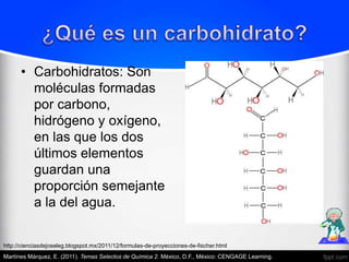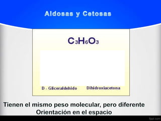 El documento proporciona información sobre la bioquímica básica de los carbohidratos. Explica que los carbohidratos son moléculas formadas por carbono, hidrógeno y oxígeno. Describe las características de las aldosas y cetosas, y explica los conceptos de isomería, epímeros, anómeros, piranosas, furanosas, dextrógiros y levógiros en relación con los carbohidratos. Además, identifica varias fuentes bibliográficas sobre bioquím
