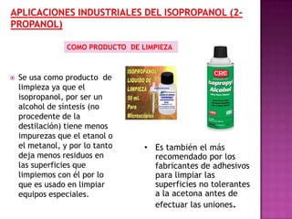 El documento describe las aplicaciones industriales y los riesgos para la salud del isopropanol. Se usa comúnmente como producto de limpieza, disolvente y anticongelante debido a su rápida evaporación y baja toxicidad. Sin embargo, la inhalación, ingestión o contacto pueden causar irritación, mareos, vómitos y afectar el sistema respiratorio, cardiovascular, gastrointestinal, ocular y dérmico. La exposición prolongada también representa riesgos.