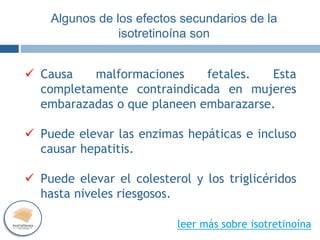 La isotretinoína es un medicamento eficaz para el acné severo pero conlleva riesgos significativos de efectos secundarios, como malformaciones fetales y problemas hepáticos. Su uso debe ser prescrito y supervisado por un médico, especialmente un dermatólogo, debido a su potencial para agravarse en algunos pacientes. La autoformulación de isotretinoína está prohibida y se desaconseja firmemente por el riesgo que representa para la salud.