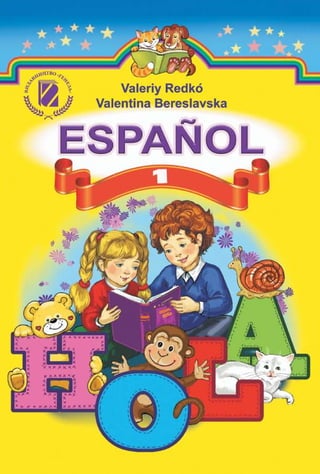 Este documento presenta información sobre un libro de texto para estudiantes de primer grado que aprenden español en Ucrania. El libro incluye lecciones sobre saludos, la familia, amigos, colores y animales. El documento introduce el libro y explica que ayudará a los estudiantes a lograr sus objetivos de aprender español.