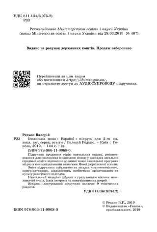 Este documento presenta un resumen de 3 oraciones o menos del contenido del libro de texto "Español" para el segundo grado de la escuela secundaria general de Ucrania. El libro continúa la serie de publicaciones recomendadas para aprender español de acuerdo con los nuevos requisitos del programa de estudios. El contenido del libro se basa en enfoques competenciales, comunicativos, centrados en la acción, centrados en el estudiante y culturales. El material didáctico se selecciona teniendo en cuenta las posibilidades