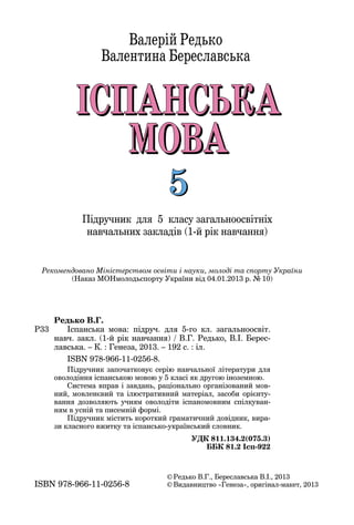 Este documento es el prólogo de un libro de texto para estudiantes de español en el quinto grado de escuelas de educación general en Ucrania. El libro fue escrito por V. G. Redko y V. I. Berezlavska y publicado en 2013 por la editorial Genesa. El prólogo presenta el libro de texto y le da la bienvenida a los estudiantes al mundo hispanohablante.