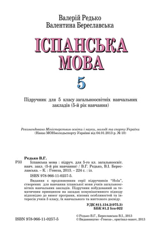 Este documento es un libro de texto para estudiantes de 5to grado de escuelas públicas de Ucrania para el aprendizaje del idioma español. El libro continúa una serie de materiales didácticos recomendados por el Ministerio de Educación de Ucrania para la enseñanza del español. Está organizado por temas y está basado en un enfoque comunicativo de acuerdo con el programa de estudios y las características de los estudiantes de 5to grado.