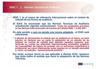 ISQC 1 establece el marco internacional para el control de calidad de las firmas de auditoría. Establece requisitos para que las firmas de auditoría diseñen e implementen sistemas de control de calidad que proporcionen seguridad razonable de que cumplen las normas profesionales aplicables y que sus informes son adecuados. El objetivo es establecer políticas y procedimientos de control interno para asegurar la calidad en la actividad de auditoría.
