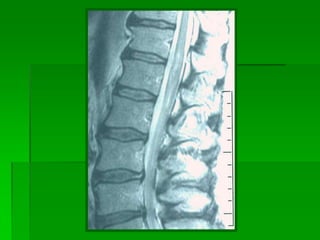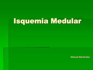 Este documento presenta 4 casos de pacientes con isquemia medular. En el primer caso, una mujer desarrolló debilidad en las extremidades inferiores debido a una lesión en D10 causada por un foramen oval permeable. El segundo caso describe a un hombre mayor con paraplejia causada por una malformación arteriovenosa dural. El tercer caso es de un hombre con debilidad en las piernas por una alteración en el cono medular. Finalmente, el cuarto caso es de una mujer con debilidad en los brazos por una lesión cervical isquémica.