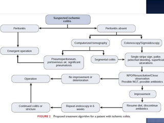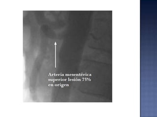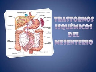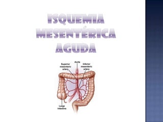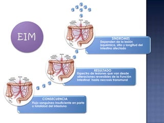 Este documento resume los síndromes isquémicos intestinales, sus causas, resultados y consecuencias. Puede variar desde alteraciones reversibles de la función intestinal hasta necrosis transmural, dependiendo de la lesión, sitio y longitud del intestino afectado. La consecuencia es un flujo sanguíneo insuficiente en parte o la totalidad del intestino, lo que puede causar desde cambios sutiles en la permeabilidad hasta necrosis transmural. El diagnóstico y tratamiento dependen del sitio y grado de compromiso intestinal.