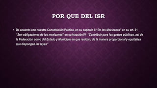 El documento explica el Impuesto Sobre la Renta (ISR) en México. El ISR grava los ingresos obtenidos por personas físicas y morales en México. Los trabajadores pagan el ISR sobre sus salarios mediante retenciones realizadas por sus empleadores. El cálculo del ISR implica restar deducciones y gastos del ingreso para obtener el ingreso gravable y aplicar la tasa correspondiente en la tabla del ISR.