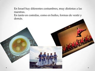 El documento explora diversas costumbres y tradiciones en Israel, incluyendo su gastronomía, religiones predominantes y el significado cultural de eventos como bodas judías. Además, aborda la educación judía, destacando la importancia de la identidad y el vínculo con Israel, así como menciones sobre el Muro de los Lamentos y el atentado en la AMIA, subrayando su impacto en la comunidad judía. Se enfatiza la necesidad de un entorno educativo que fomente la identidad judía y la conexión con la historia y cultura del pueblo judío.
