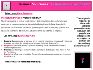 Issanova Soluciones ofrece soluciones integrales e innovadoras para la gestión del talento humano y el desarrollo profesional de individuos que promuevan su evolución con propósito e incorporando estrategias de gestión con innovación y transformación. Ofrece servicios como marketing personal, atracción de talento, análisis de procesos de recursos humanos, y consultoría en redes sociales 2.0 para apoyar la estrategia y evolución de las organizaciones.