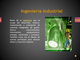 La ingeniería industrial se ocupa del desarrollo, mejora, implantación y evaluación de sistemas integrados de recursos. Tiene como objetivo mejorar la productividad y competitividad de las organizaciones. El ingeniero industrial puede trabajar en empresas de consultoría, comerciales, constructoras e instituciones educativas. Realiza actividades como diseñar sistemas de inventarios, métodos de trabajo y control de calidad.