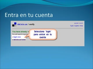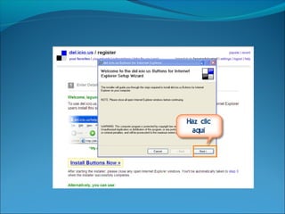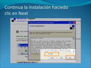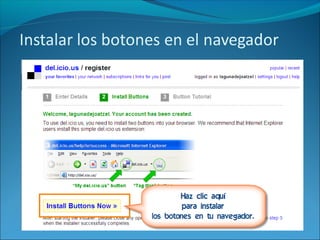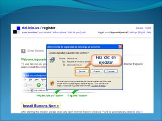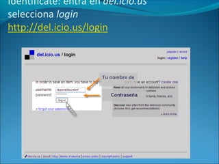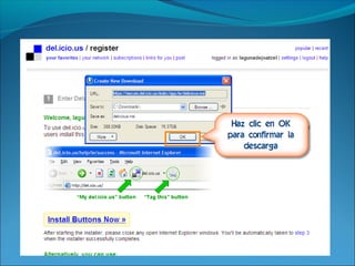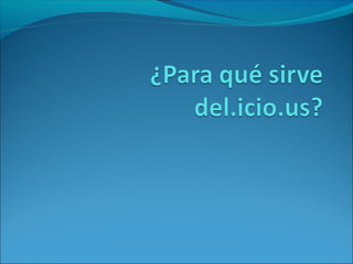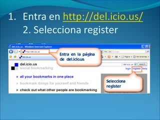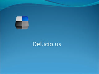 Del.icio.us es un marcador social que permite guardar páginas web favoritas en Internet y acceder a ellas desde cualquier ordenador. Los favoritos no se organizan en carpetas, sino mediante etiquetas que describen el contenido. Del.icio.us se instala como complemento en el navegador para poder marcar páginas como favoritas y ver y compartir los favoritos con otros usuarios.
