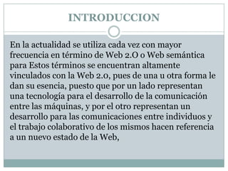 El documento presenta una introducción a la Web 2.0, describiendo sus características principales como el trabajo colaborativo entre usuarios y la importancia de los datos. Luego detalla aspectos como el valor que aportan los usuarios y las aplicaciones basadas en servicios cooperativos. Finalmente concluye que la Web 2.0 facilita nuevas formas de comunicación e información y depende de la participación de los usuarios.