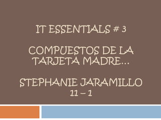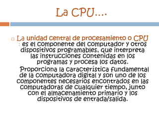 La tarjeta madre contiene la CPU, módulos de memoria RAM, disipador de calor y ventilador. La CPU procesa datos e instrucciones. El compuesto térmico mejora la disipación de calor entre componentes. Los módulos RAM almacenan datos e información de forma temporal. El disipador de calor y el ventilador ayudan a reducir la temperatura de los componentes electrónicos.