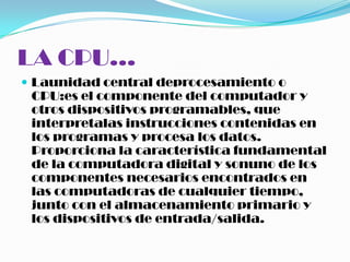 Este documento resume los componentes principales de una tarjeta madre, incluyendo la CPU, módulos de memoria RAM, disipadores de calor y cómo instalarlos correctamente. La CPU procesa instrucciones y datos, mientras que la memoria RAM almacena temporalmente datos e instrucciones. Los disipadores de calor ayudan a disipar el calor de estos componentes mediante la transferencia de calor al aire. La instalación correcta de estos componentes en la tarjeta madre es fundamental para el funcionamiento del computador.