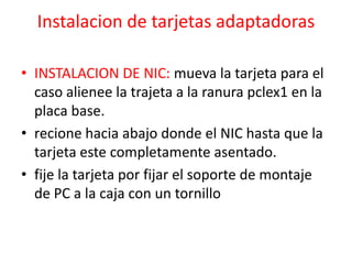 Este documento describe diferentes tipos de tarjetas de expansión para computadoras. Explica cómo instalar tarjetas de red, tarjetas inalámbricas y tarjetas de video. Luego procede a definir y describir brevemente tarjetas de red local, tarjetas PCMCIA, tarjetas de sonido, tarjetas controladoras, tarjetas fax-modem y tarjetas de video. Finalmente, menciona otros tipos de tarjetas como tarjetas de diagnóstico y tarjetas capturadoras de video.